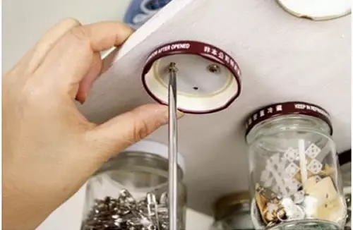 然后用螺絲將瓶蓋排列好,固定到木質(zhì)的儲(chǔ)物板上面。