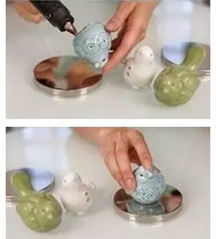 只要將自己喜歡的小飾品涂上粘黏劑,最好是熱熔膠,然后粘在老干媽罐頭的瓶蓋上面即可。