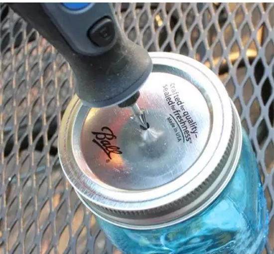 首先在罐頭蓋子上鉆一個(gè)孔,大小應(yīng)該跟放進(jìn)去的擠壓器管子一樣大。